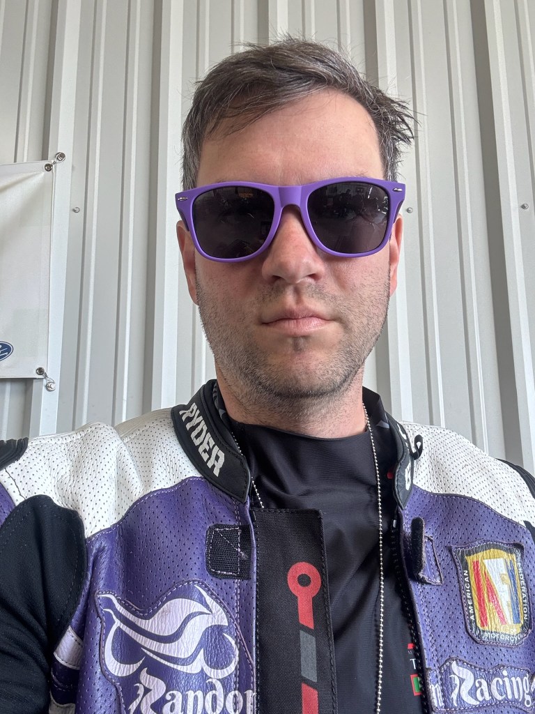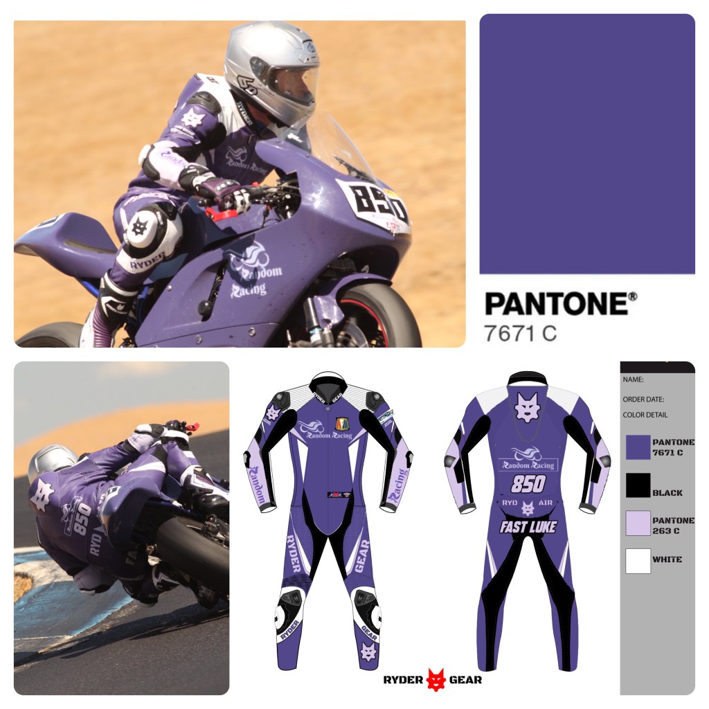 After getting myself riding again this summer, time came to accept delivery of my new custom race suit from Ryder Gear. I worked with owner Tony to match the unique (and awesome) color scheme of Random Racing while also sizing to match my body measurements. The result is the most comfortable (thank you, kangaroo leather), best fitting, and most beautiful race suit I have owned. We even did matching gloves and boots.